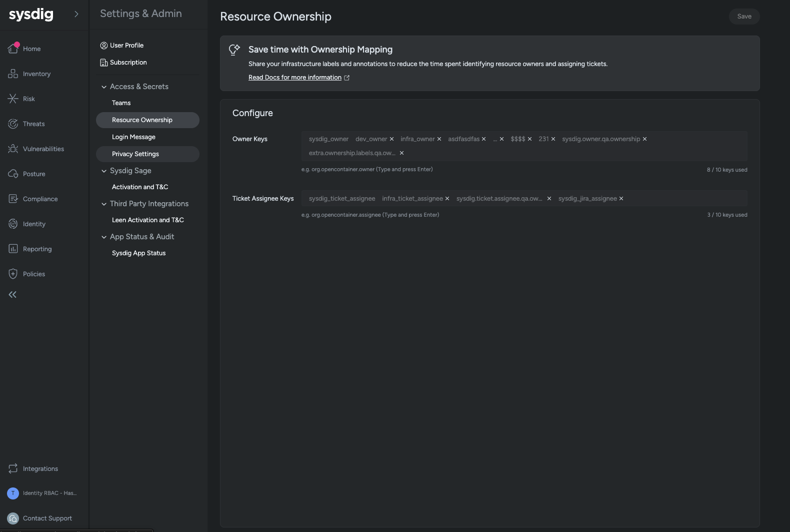 The Resource Ownership feature allows Sysdig to read metadata (labels or tags) from your infrastructure to automatically identify who is responsible for a specific resource and who should be assigned any resulting tickets.
