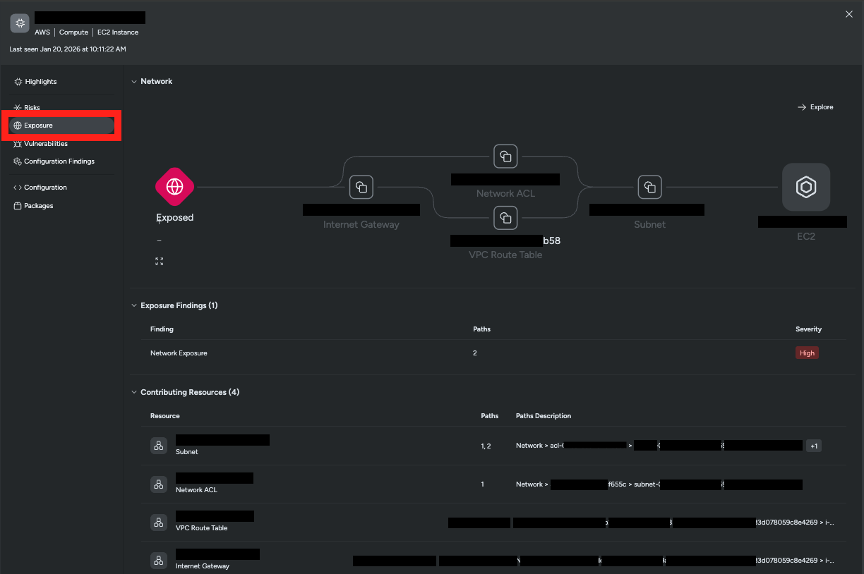 The Exposure Findings tab in the UI provides detailed information about why a resource is exposed and all the network components involved in the exposure paths.