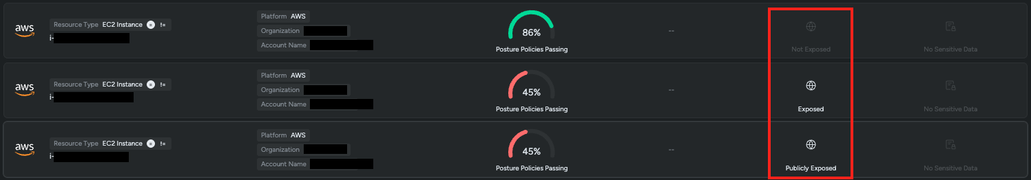 - Exposed: Indicates that the resource has been identified as exposed to the internet through one or more network paths (Not validated with port scanning)