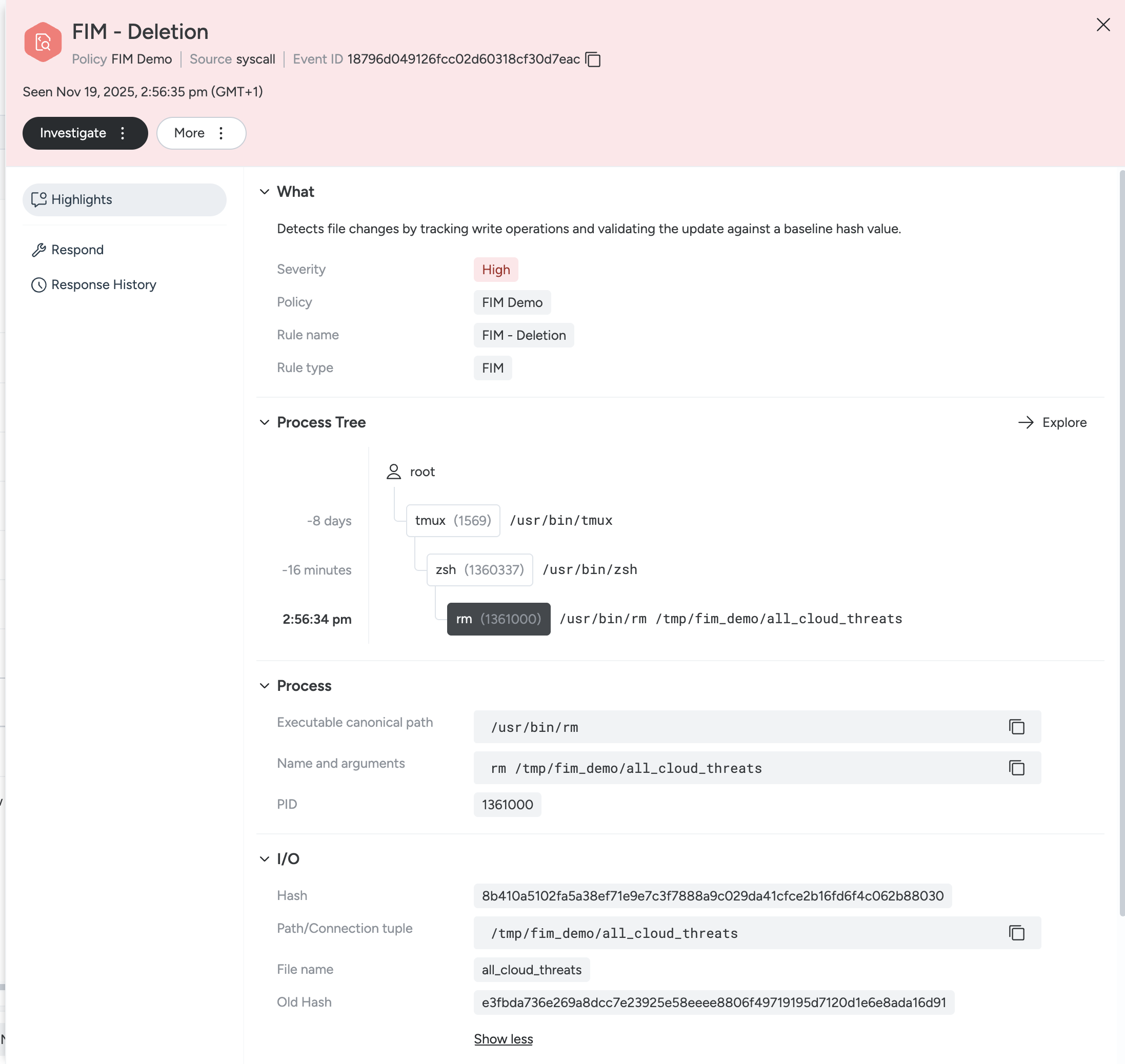 A new runtime detection type, File Integrity Monitoring (FIM), is now available. You can configure this detection by creating FIM Policies and using Host Shield >= 14.3. Through this detection, you can meet PCI DSS Requirements 10.5.5 and 11.5.