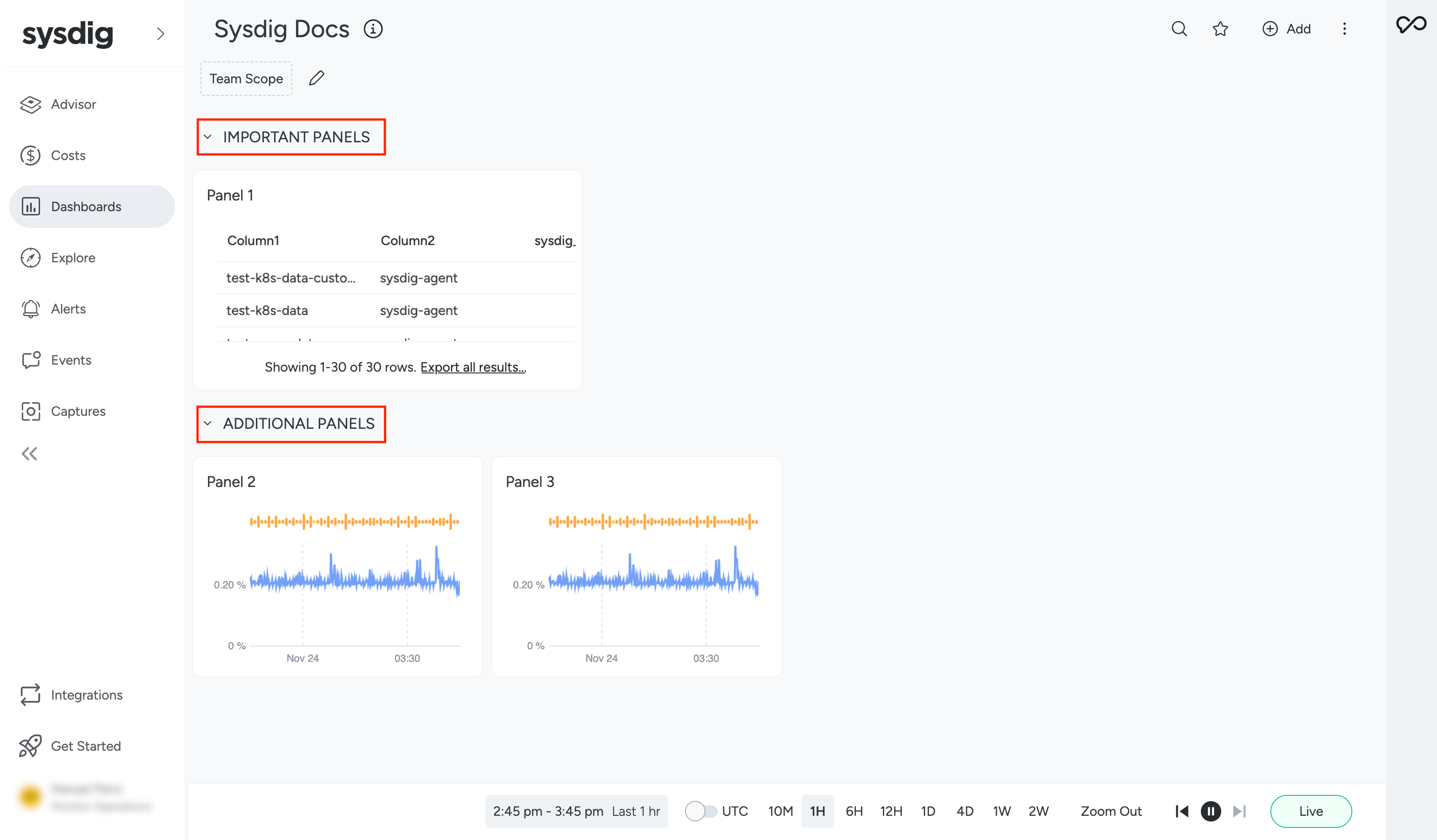 You can use dashboard sections to group related panels and organize large dashboards more effectively. Sections can be expanded or collapsed. When collapsed, the panels inside the section remain hidden. Expand a section to view all its panels.