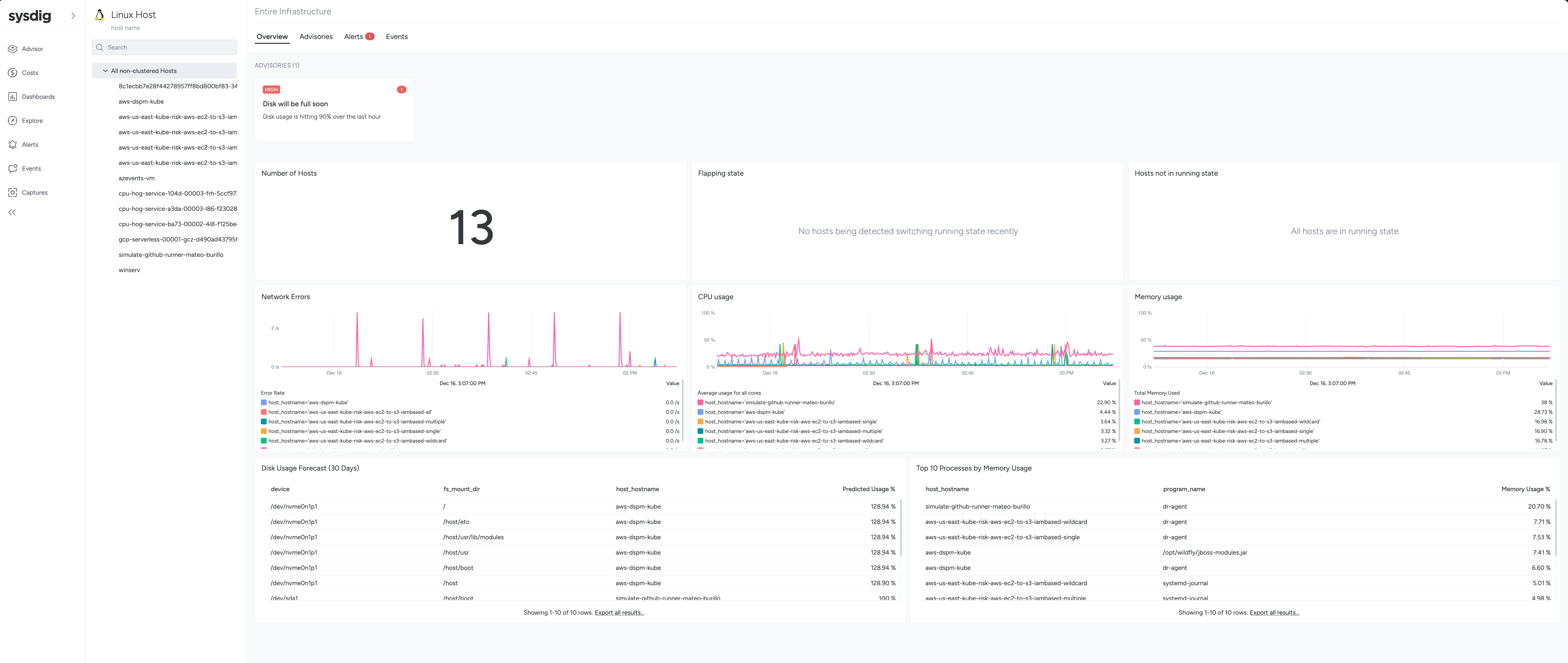 Advisories evaluate the thousands of data points being sent by the Sysdig agent, and display a prioritized view of key problems in your infrastructure that affect the health and availability of your Linux Hosts.