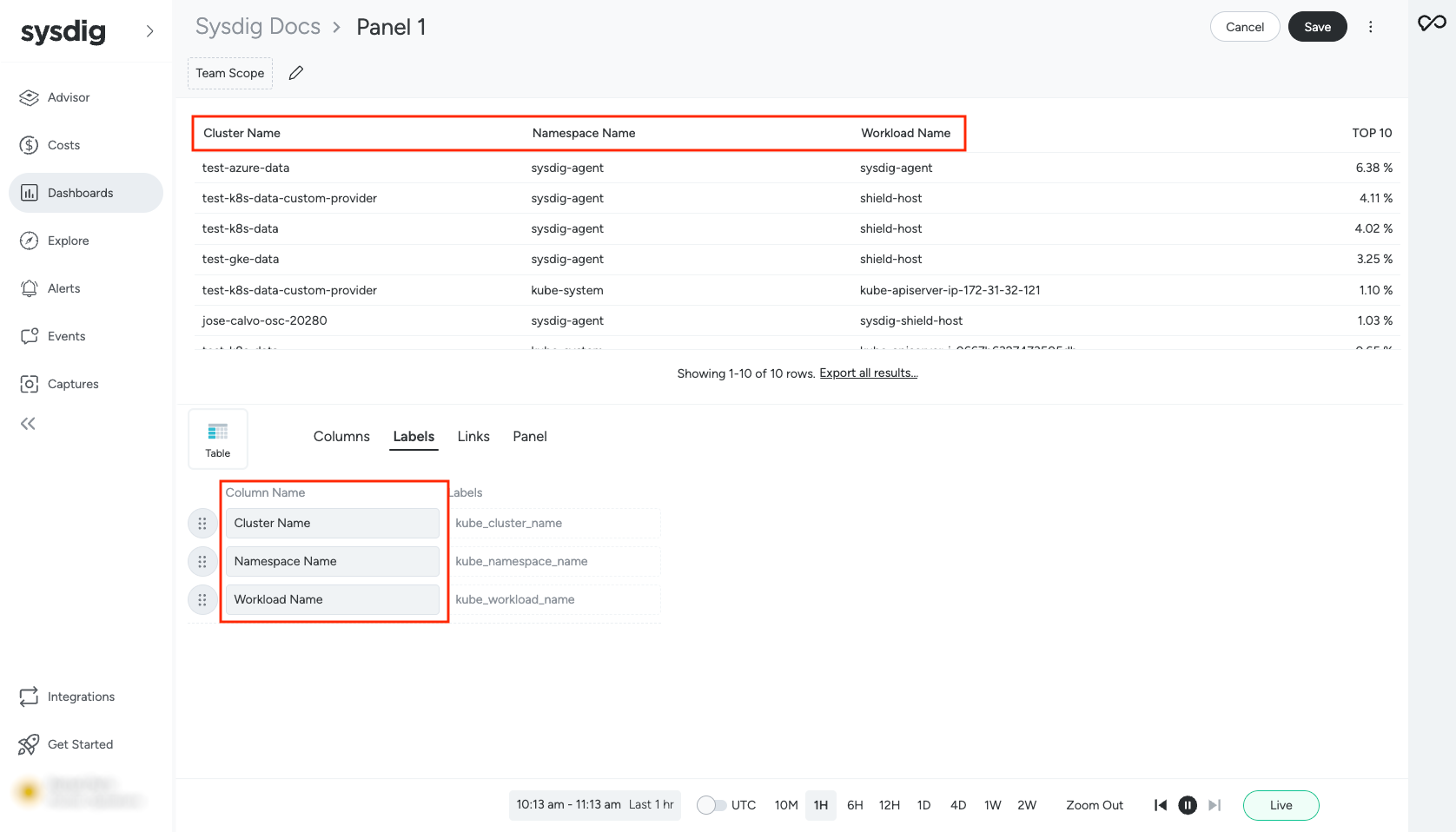 In this example, the panel scope is limited to two clusters (netsec-load-data, test-k8s-data), one namespace (kube-system), and one workload (coredns).