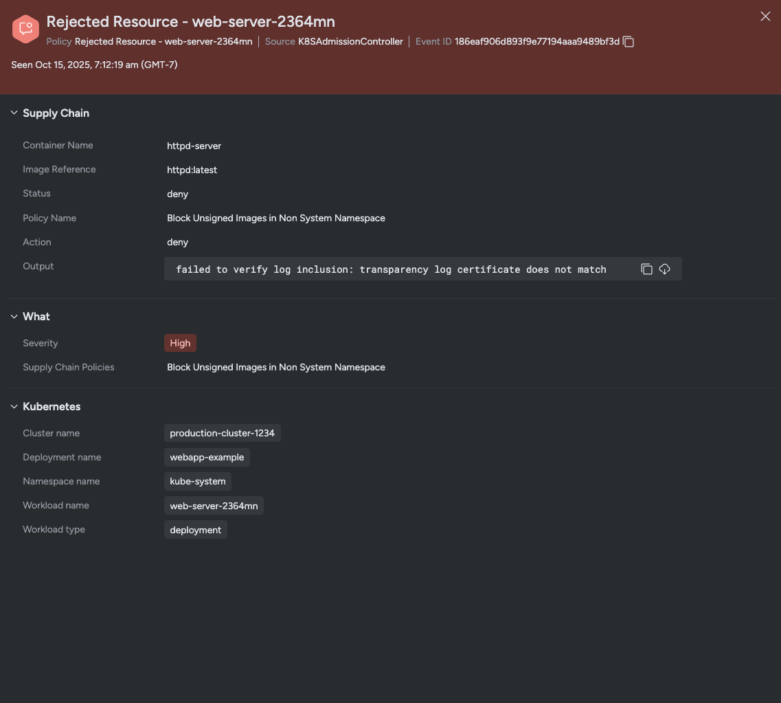 You can observe Supply Chain Admission Control events in two locations within the Sysdig Secure platform: