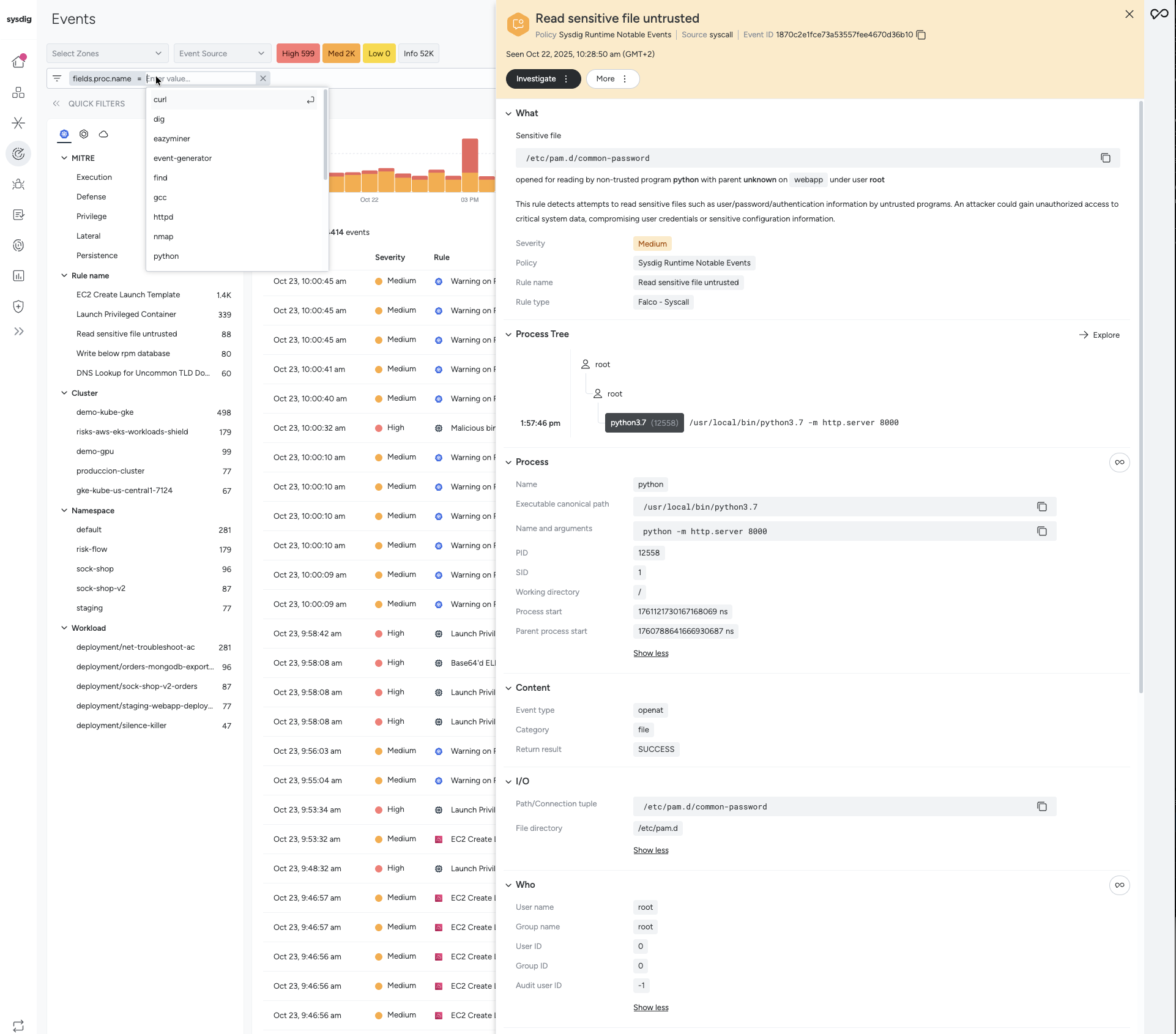 Therefore, you can quickly filter for workload events with ruleType = Falco - Syscall